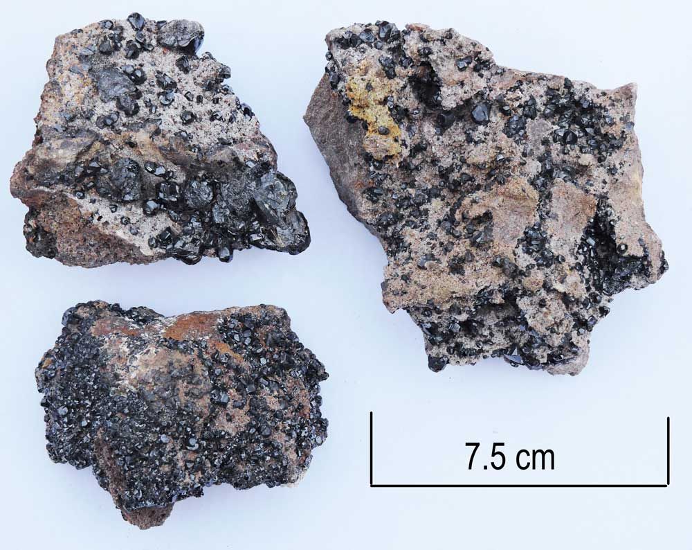 Sphalerite, (Zn,Fe)S, Zinc sulphide, is the main ore of zinc, and is usually associated with galena. The specimens here were collected from Driggeth mine, Caldbeck, Cumbria. The small, brilliant black crystals of sphalerite are embedded in cavities in the limestone rock. The local geology suggests that the rocks here are Ordovician in age.